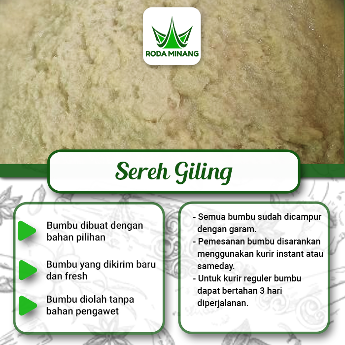 -> Menggunakan 100% Sereh / Serai asli yang di haluskan menjadi bumbu giling tanpa menggunakan bahan pengawet kimia dan pewarna tambahan.
